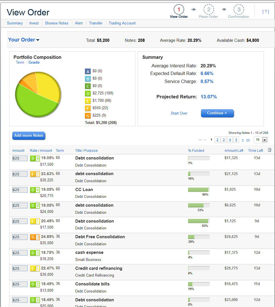 Hey! That was an unexpected result. I could see that Lending club was automatically calculating the average interest rate of all of my proposed loans, subtracting the expected default rate based on their 5-year history of thousands of other loans with these characteristics, and presenting me with an estimated final rate of return (13.07% annually in this case). In other words, the site was doing its OWN data mining for me, making that third-party lendstats page I mentioned earlier redundant as far as I can tell.