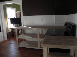 But in a house of this price, we didn’t even want to spend five grand. Instead, we restored the existing base cabinets, and I used some eco-friendly blue stained (aka “beetle kill”) wood from local forests to build open-front shelving units instead of the old upper cabinets, and I also made some countertop units for the other side of the kitchen, where there were formerly just naked appliances sitting on the floor. We made it all blend together by creating tile countertops for both sides. I won’t pretend this is as nice as a new set of Ikea cabinets, but when you see it in person it adds great personality to this old rustic house, and is quite functional too – for about 80% lower cost even after paying myself for labor.