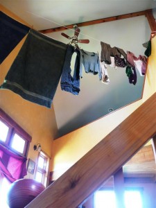 Our house is wonderful to live in, even if I see a few of the boo-boos I made during the building, every single day. It is easy to heat with our wood stove. We incorporated an “inefficient” cathedral ceiling in our design which we have made efficient by stringing an indoor clothes’ line up there – eliminating the need for a clothes dryer.