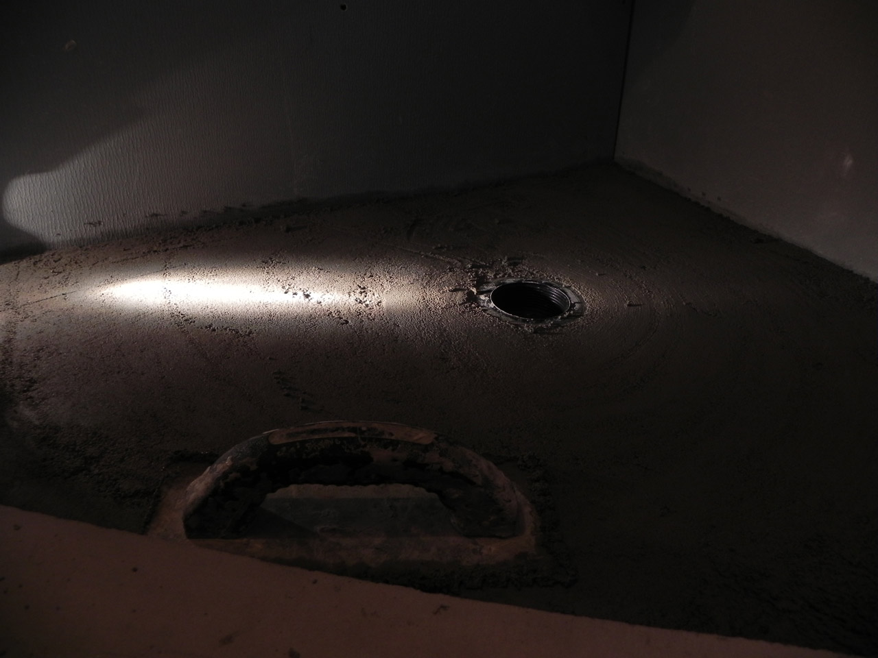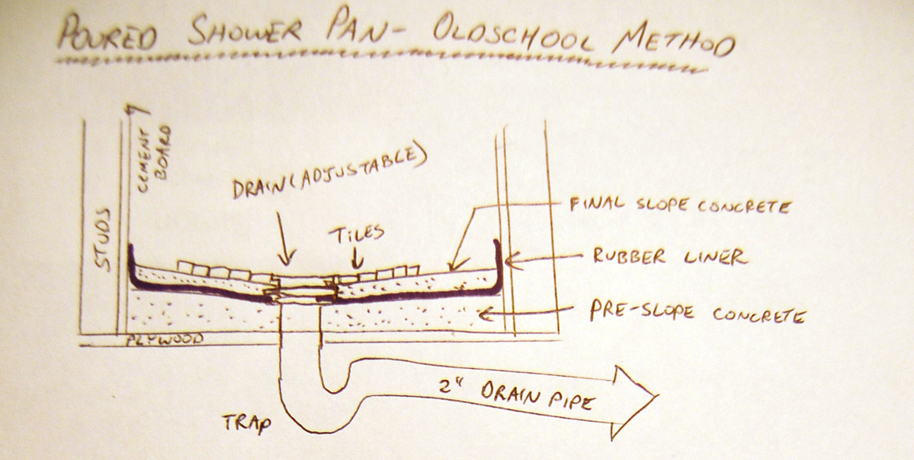 This is the part where things get exciting, and this article will hopefully save DIY shower builders some time and money. In the olden days (and still today for the most part), poured showerpans were done in three steps: the poured pre-slope, the rubber liner, then the poured top slope. It looked roughly like this: