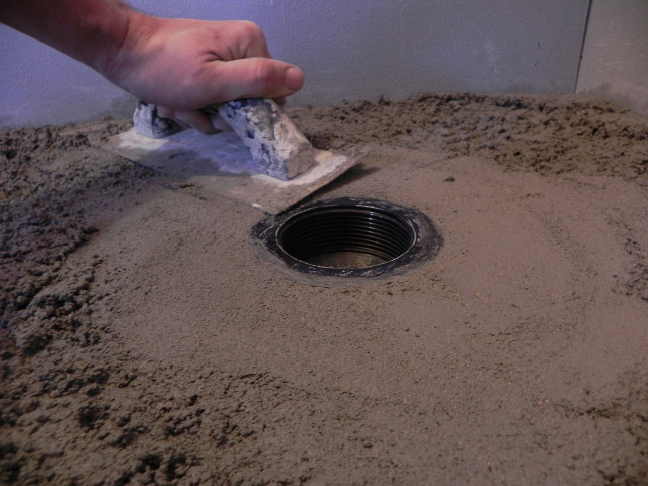 Dump it in, spread it around. Note that the drain’s removable/adjustable top is removed for this step. But cover the remaining part of the drain with tape, lest you get concrete into the trap!