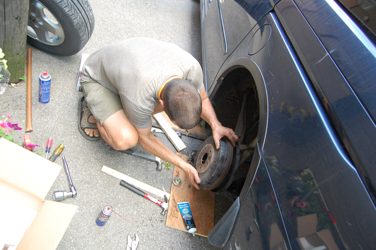 As a final note, Be Patient: There are always hiccups when you do things for the first time. We did well with disassembly, but had a hell of a time putting the new hub on. It was tight, and it requires that you hold it in very straight alignment to avoid getting stuck on the axle. There was a scary moment where I wondered if my van would be stuck in the parking lot behind his apartment building with a missing wheel forever. Then I took a deep breath and remembered that this is not the first time this procedure had been performed on Earth, and if others had done it, I could surely do it t0o. By placing a block of wood over the new hub and hammering it onto the axle, then using the axle nut to crank it on the rest of the way, we got the job done.