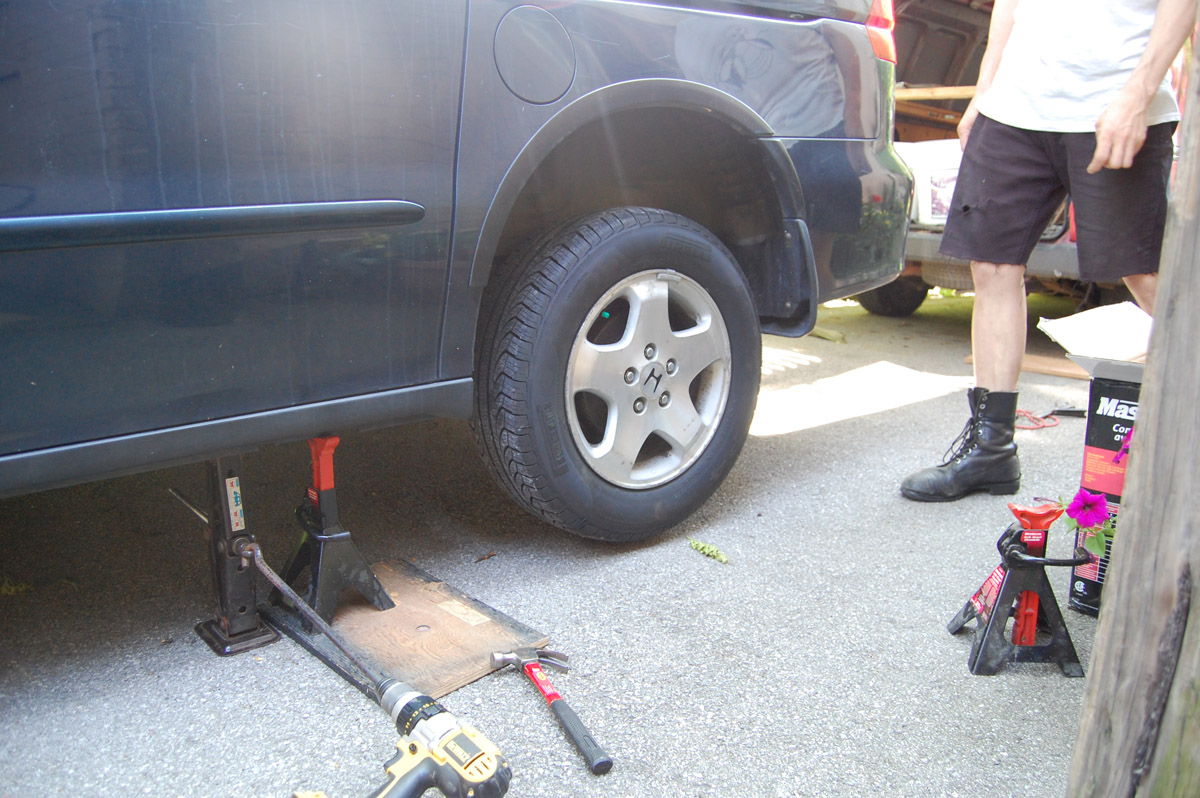 Nick and I dove into the project. Our equipment was limited (there was no air compressor so I couldn’t use my fancy new air impact gun, and his old car jack was barely big enough for my van), but we improvised as needed and these were the results: