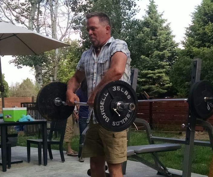 J.D. completes a mandatory set of clean-and-presses with a barbell in my back yard, the standard way earn a beer at the MMM residence. June 2015.