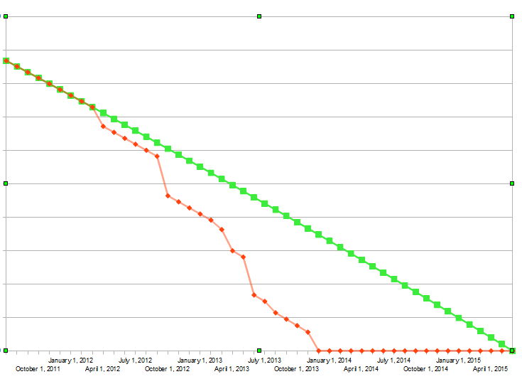 So I went into Kung Fu spreadsheet mode and my predictions looked something like what you see below. The green line is how long it could have taken us. The red line was another, more serious route. I turned to Mrs. Toque to say:
