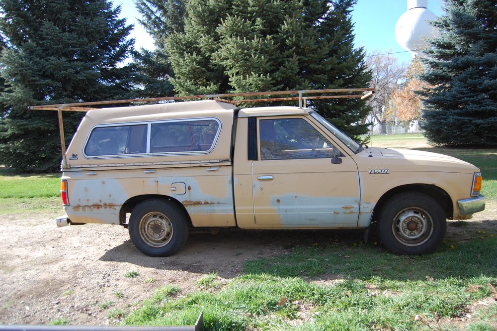Back when money was tighter (I only had $700,000 in the bank but at least my house was paid off), I had this older truck – a 1984 Nissan compact pickup. This thing built multiple houses and kitchens, carried steel girders and landscaping materials,  and protected me from weather of all seasons. It has an aftermarket cupholder on the driveshaft hump which is currently full of hardened surf wax and 10 Peso coins.