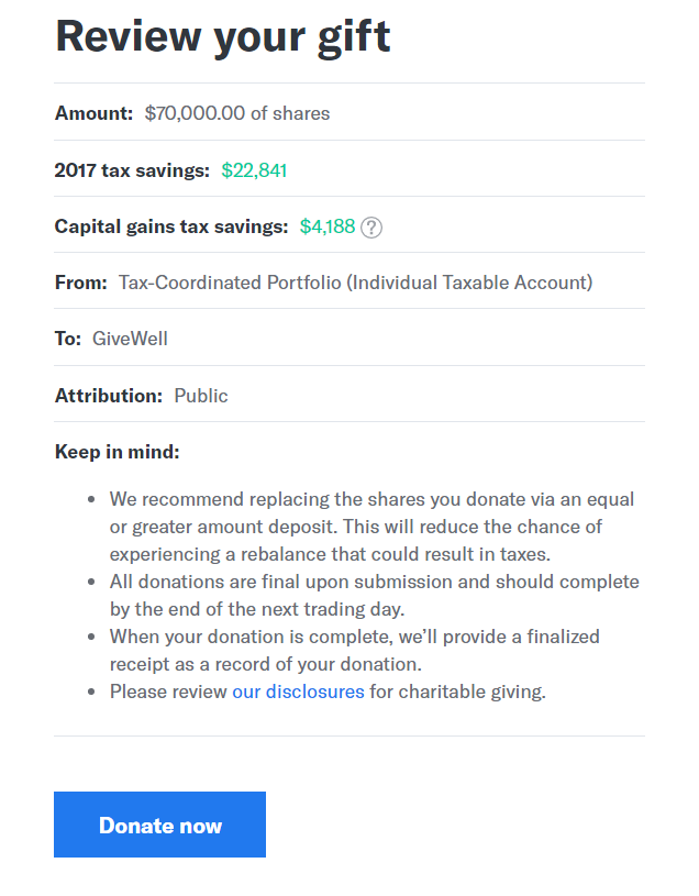 As part of writing this article, I made part of my $100,000 donation via Betterment’s new system. I have three accounts with the company (my public Betterment Experiment, a rolled-over IRA, plus a personal taxable account with the largest balance of the three). All three accounts have seen rapid appreciation due to the current boiling-hot stock market, so there are lots of capital gains available to harvest.