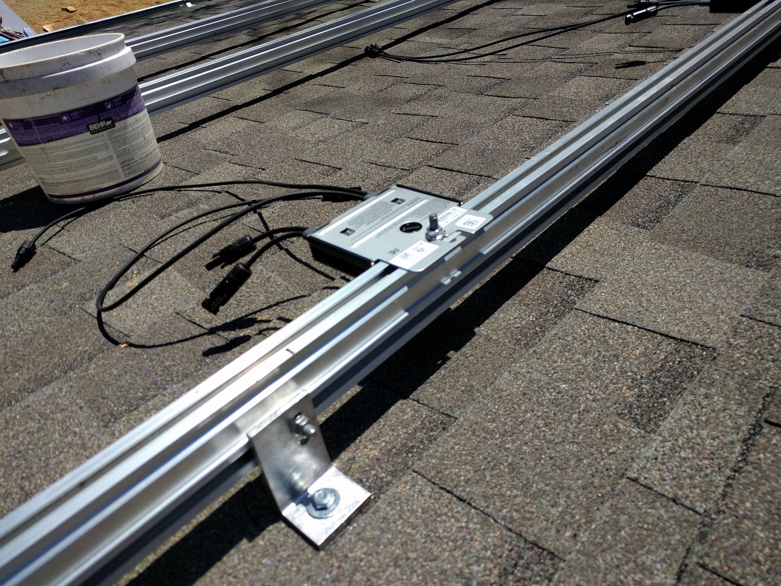 Optimizer mounting (face down), plus a good shot of the connections between roof, brackets, and rails. Note – a solar installer saw this and said he suggests you use flashings like this for extra protection on those L-feet.