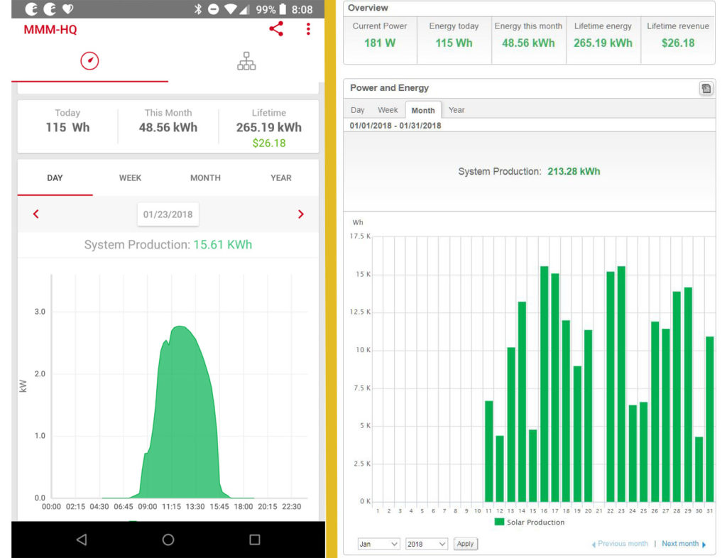 My inverter from Solaredge comes with a really nice monitoring features, available from both a phone app and any browser. Plus, you can share a public version of your page with anyone. Here’s one I made for the MMM-HQ array.