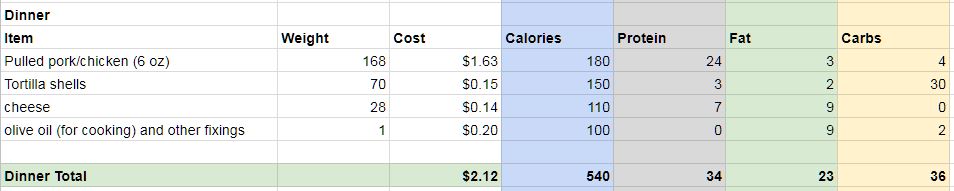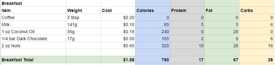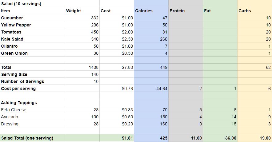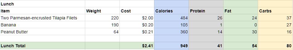 /writes 2k words complete with spreadsheet breakdowns of individual ingredient weight and price/calorie of diet.