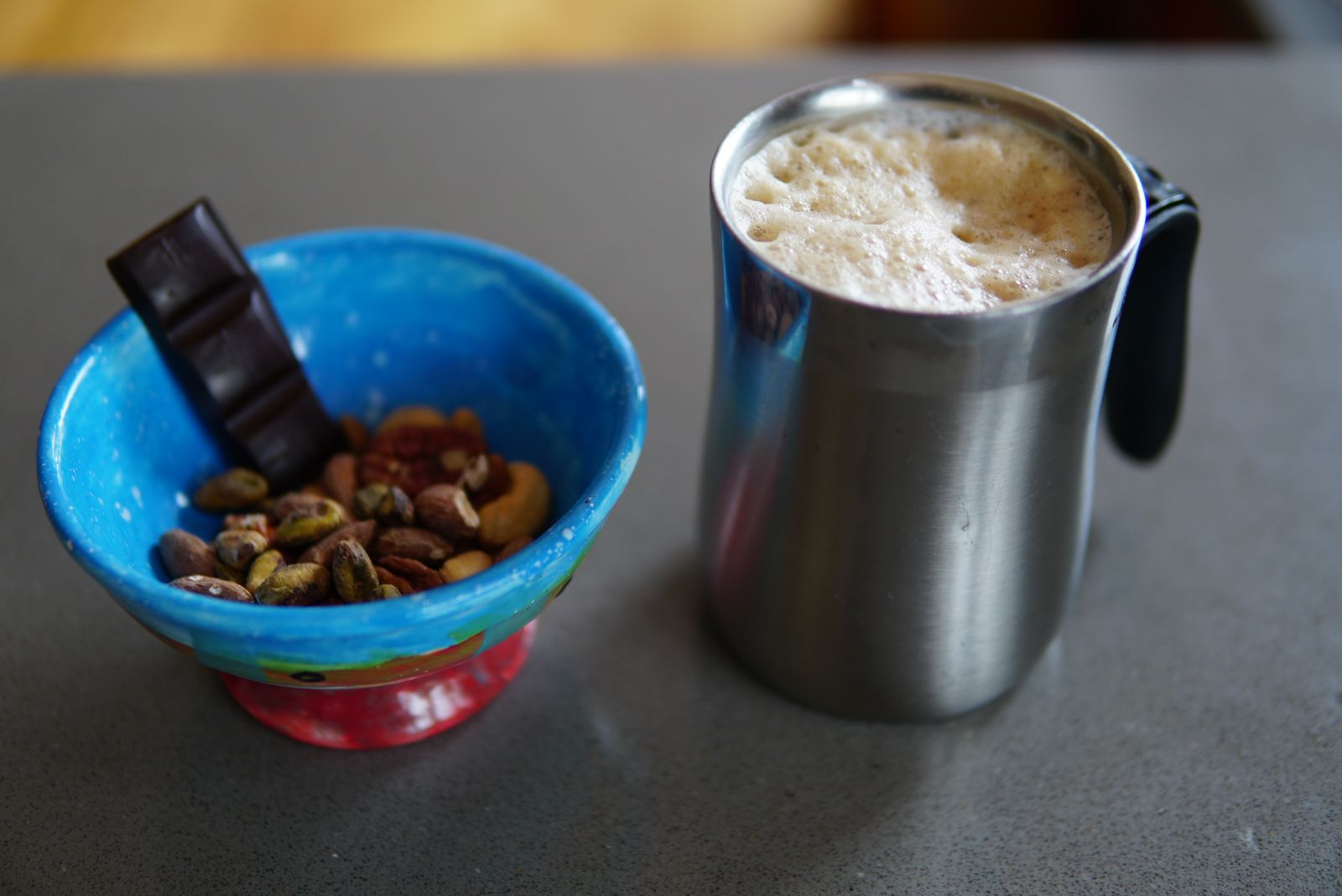 Subjectively, I find this breakfast is satisfying and delicious, but also keeps my body in low-sugar mode so I can begin a day of physical labor without hunger – and potentially work as long as I want, even skipping lunch and running on stored bodyfat if desired. (Note, I make the coffee with this super cheap but super reliable espresso machine and heat/fluff the milk and coconut oil together to get the tasty results).
