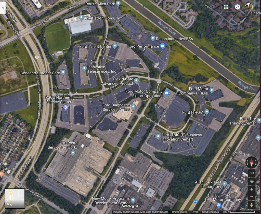 One square mile of suburban Detroit. Note the amount of space wasted on accommodating cars. Without the cars, you could house AND employ about 50,000 people with this much land.
