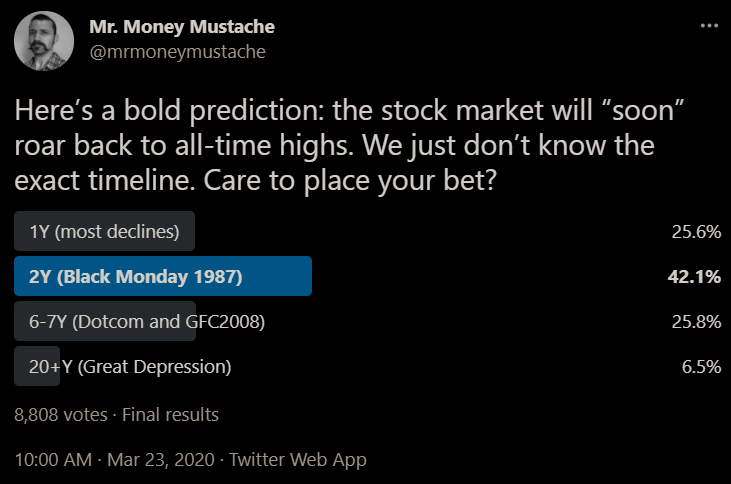 And even when a crash comes, you never know how long it will last. One year ago, world stock markets collapsed in a great Covid-era panic. I conducted a Twitter survey to see how long people thought it would last. A full 75% of us thought it would be at least two years until stock prices came back. Being an incurable optimist, I guessed one year myself, and the correct answer was even faster: five months.