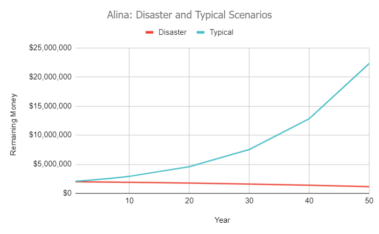 Uh-oh. So the worst things have happened in many areas of her economic life, and Alina lives out the next 40 years of her life and dies with only $1,395,000 in the account. What a harrowing close call!