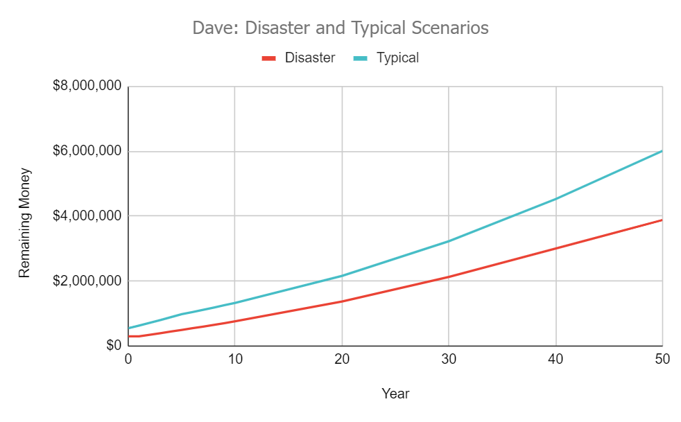Dave does incredibly well too, even starting from a much smaller initial net worth.