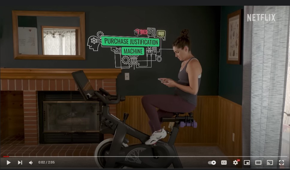 My favorite part is probably that my old concept of the “Purchase Justification Machine”, first described in this 2019 article about me not buying a Tesla, made it into the movie in the form of a glorious and silly on-screen animated graphic – grinding away at Kim as she browses Amazon while riding her Peloton.