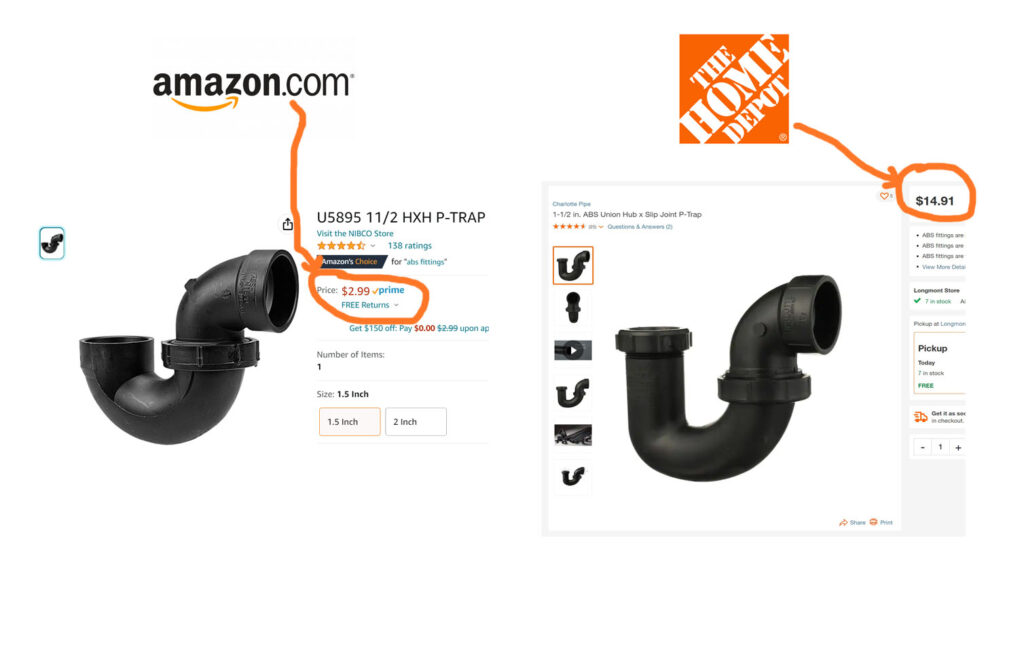 Here’s a recent example – shocked by Home Depot’s sudden price increase on sink traps, I checked Amazon and sure enough they were still the proper price of about three bucks. So I bought five to re-stock my inventory because I just know there are many more kitchens (and bathrooms) in my future.
