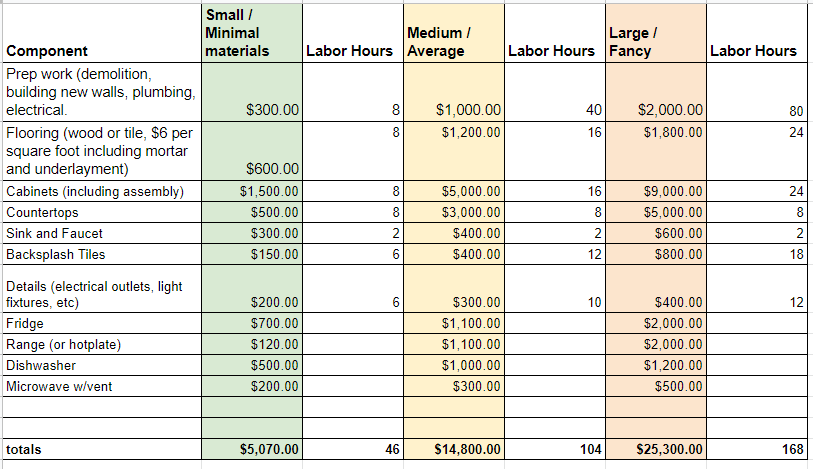 The dollar figures are just for the materials including appliances, and the labor hours are what I’d budget for myself or another professional – you can adjust as needed based on your own skill level. I’ll also link a slightly more detailed version of this spreadsheet here.