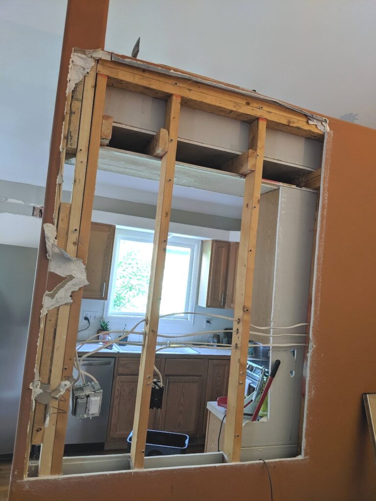 • If your kitchen is on the first floor with another level above, the wall may be load bearing, especially if it is perpendicular to the floor joists above it. In this case you can still open up the wall and replace it with a beam and posts. But that’s a task for experienced builders – bring in some help if you don’t know how to do this already.