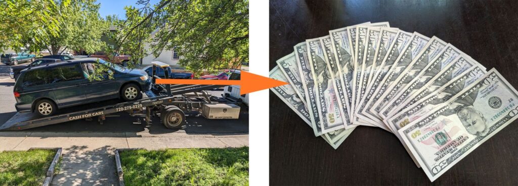 I ended up using an online car salvage service called Peddle*, at the recommendation of a friend. With about five minutes of entering the details of my old Honda, their system offered me $715, and then a towtruck came and took it the next day – and actually gave me the payment in cash, which I found kind of fun. I made a point of using all of that money for splurges like dinners out, in keeping with the theme of this article.