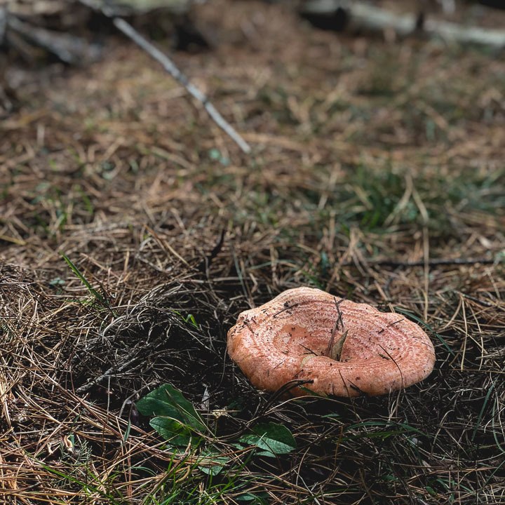 A good place to find the milk caps is around old fallen branches and tufts of grass and generally anywhere that there is a good cover of pine needles.