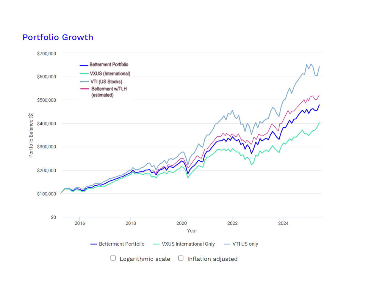 Over these first ten years, the Betterment portfolio has fought an interesting battle: US mega cap stocks (like Apple and NVidia) have gone crazy and outperformed both the rest of our economy, and the rest of the world. Meanwhile, bonds have had a slow decade, due to low interest rates. This has handicapped the Betterment allocation relative to a hypothetical helping of purely US stocks. Fighting these macroeconomic trends on the positive side, Betterment’s tax loss harvesting and rebalancing has partially made up some of the difference (see below for details on that harvesting).