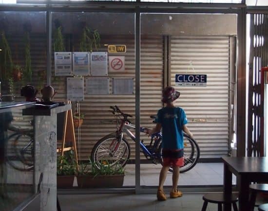 At 8.30 am the guy, our chef/ night-watchman/cleaner/security guard was still passed out. We were up, dressed, ready to go for breakfast, there was no way I was going to eat in that café again, even if the staff had been awake. We couldn’t get out, the steel shutters were down.