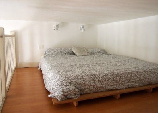 Both rooms featured a futon-type bed on a mezzanine level, accessed by a steep ladder. The sofa bed in the living area folds out to provide two more beds. A small private kitchen and tiny bathroom is a part of each apartment.