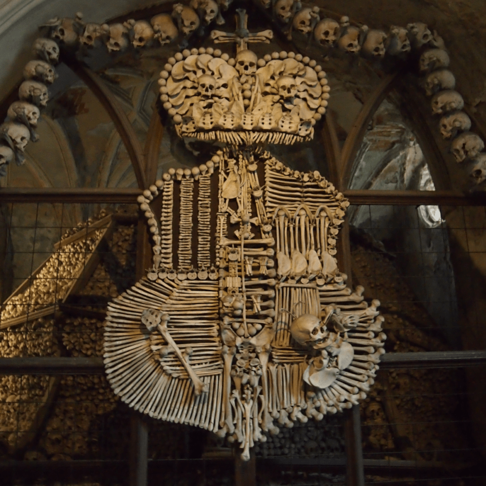 The Church of Bones has an eery beauty in its structures in the ossuary. There are large constructions like the coat of arms or the chandelier, and also less imposing structures such as skull chalices and pyramids, or the arching roof that has bones decorating it.