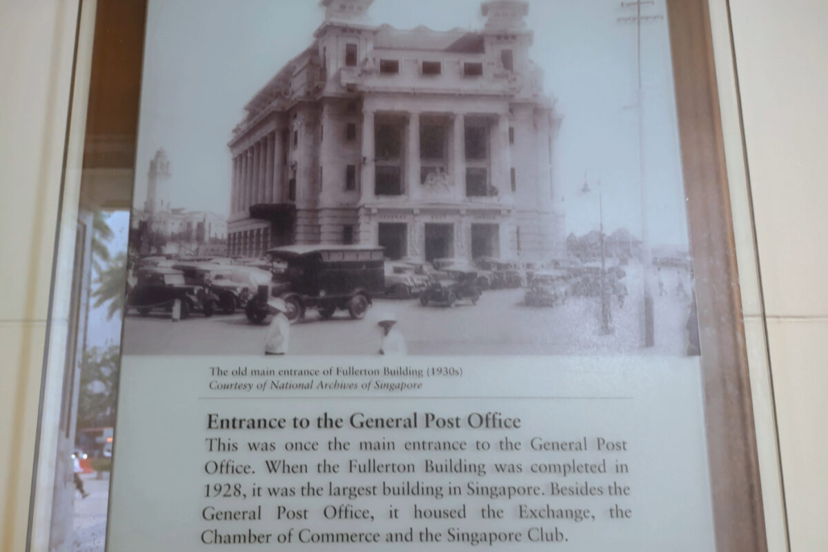 The building that is the Fullerton Hotel today was built in 1928 and was the biggest building in Singapore at that time. It housed the post office, Singapore Club, The Exchange and the Chamber of Commerce.